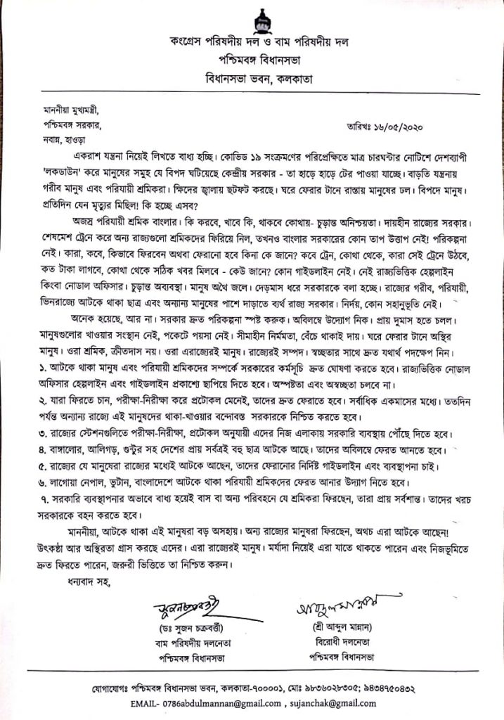 কোভিড - ১৯ সংক্রমণের মোকাবিলায় লকডাউনের দেড় মাসের বেশি অতিক্রান্ত । এই পরিস্থিতিতে পরিযায়ী শ্রমিকদের নিজ রাজ্যে ফিরিয়ে নিয়ে আসার ক্ষেত্রে কোনো সদর্থক ভূমিকা, পশ্চিমবঙ্গ এর মুখ্যমন্ত্রী এখনো দেখতে পারেননি। যেখানে অন্য রাজ্য গুলি কেন্দ্রের কাছে গড়ে ২০০টির বেশি ট্রেনের জন্য আবেদন করেছে কেন্দ্রের কাছে, সেখানে পশ্চিমবঙ্গ মাত্র ৭ টি ট্রেন রাজ্যে এসেছে। কেন্দ্রের যে প্যাকেজ ঘোষণা হয়েছে, সেখানে পরিযায়ী শ্রমিকদের কোনো উল্লেখ নেই। সুপ্রিম কোর্ট ও কার্যত হাত তুলে নিয়েছে। এমত অবস্থায় অনেক জরুরি রাজ্যের মধ্য ও ভিন রাজ্যে আটকে পড়া পরিযায়ি শ্রমিক, পর্যটক, অসুস্থ মানুষ,শিক্ষার্থীদের ফিরিয়ে আনার বিষয়টি। অপরিকল্পতভাবে ডাকা এই লকডাউনে বিপর্যস্ত এই মানুষগুলোর বিষয় ও রাজ্যের করোনা পরিস্থিতি বিবেচনায় রেখে কিছু প্রয়োজনীয় পদক্ষেপ গ্রহণের বিষয়টি জানিয়ে মুখমন্ত্রী কে আবার যৌথভাবে চিঠি দিলেন বাম পরিষদীয় দল ও কংগ্রেস পরিষদীয় দল। নীচে চিঠিটির বয়ান দেওয়া হল।