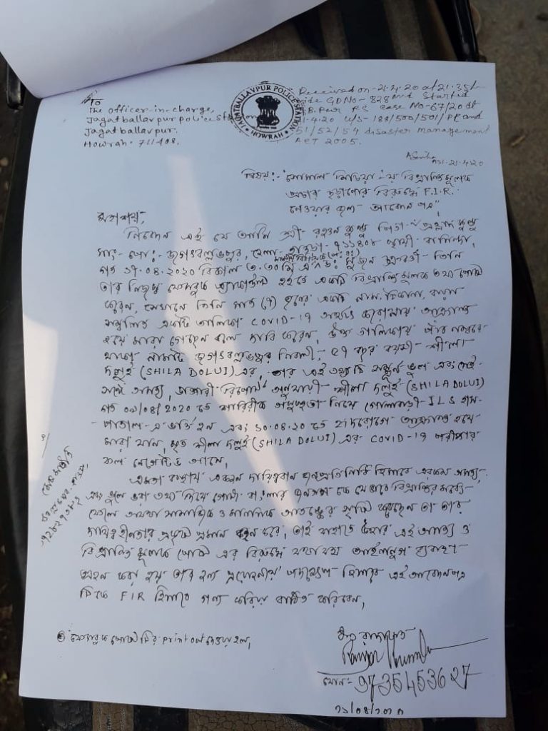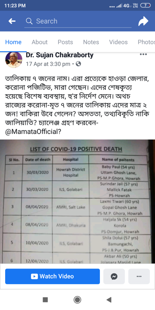 জগৎবল্লভপুরের এক মহিলার। জগৎবল্লভপুর ২ নম্বর পঞ্চায়েতের প্রধান রঞ্জন কুণ্ডুর অভিযোগ, ওই মহিলা করোনা আক্রান্ত ছিলেন না। তিনি গোলা বাড়ি থানার কাছে একটি হাসপাতালে হৃদরোগের কারণেই মারা গেছেন । অর্থাৎ রঞ্জনবাবুর দাবি যে, ফেসবুকে ভুল তথ্য ছড়াচ্ছেন সুজন চক্রবর্তী। এই অভিযোগে স্থানীয় থানায়