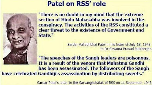 আজ ৪৩০ মিলিয়ন ডলার খরচ করে ৬০০ ফুট উচ্চতার মূর্তি বসানো হচ্ছে সরকারি খরচে... সর্দার প্যাটেল কে লৌহ পুরুষ হিসাবে আখ্যায়িত করা হচ্ছে, এসবের উদ্দেশ্য স্পষ্ট - যাতে সবাই ভুলে যায় এই লৌহ পুরুষই স্বাধীন ভারতে আর এস এসকে নিষিদ্ধ করার হিম্মত দেখিয়েছিলেন। আর এস এস বারে বারে ভুল করে, প্রকৃত ইতিহাস কেউ কেউ হয়ত ভুলে যায়, সবাই নয়।