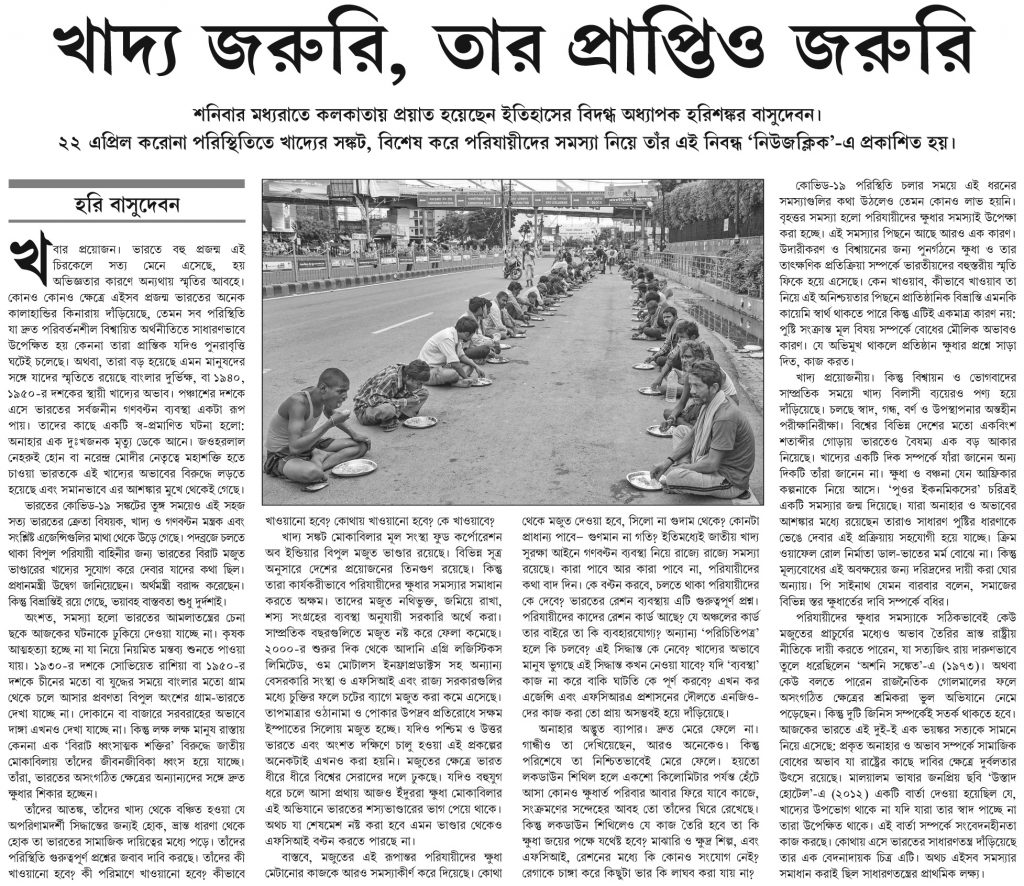 করোনা পরিস্থিতিতে খাদ্য সঙ্কট ও পরিযায়ী শ্রমিকদের সমস্যার কথা নিয়ে, ইতিহাসবিদ হরিশঙ্কর বাসুদেবনের লেখা। গত ২২ এপ্রিল ২০,নিউজক্লিক'এ, তার লেখা প্রকাশিত হয়।