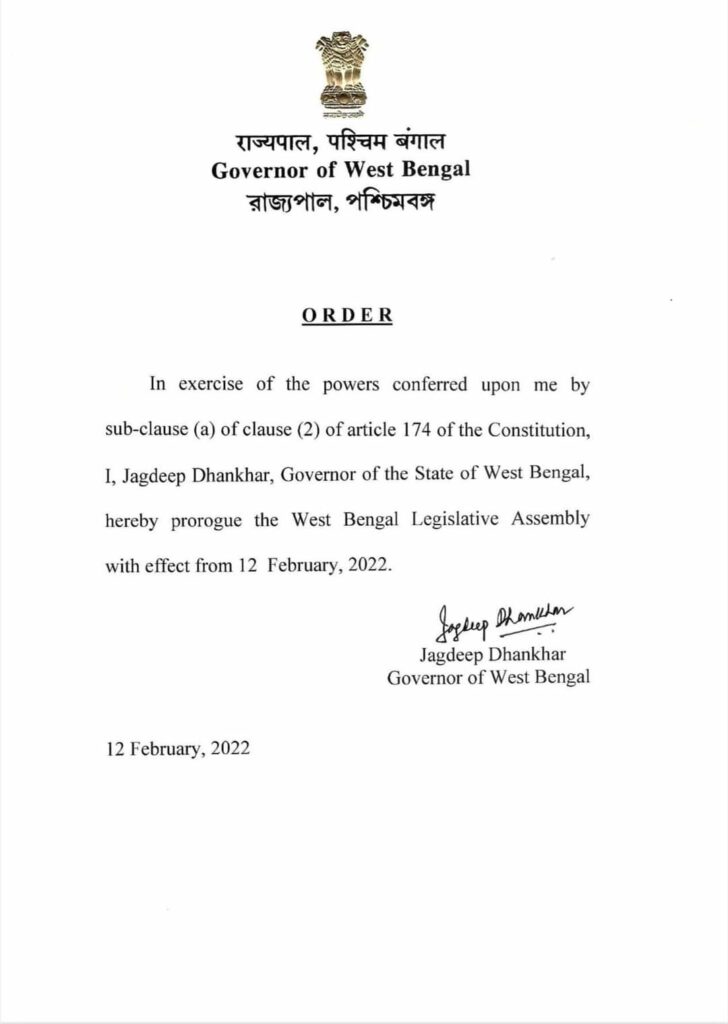 আজ হঠাৎ রাজ্যপাল সংবিধানের ১৭৪ ধারার ২ক ধারা অনুযায়ী বিধানসভার স্থগিত করলেন কেন? এর আইনি কি বিশ্লেষণ আছে সেটা জানার চাইতেও আগে এটা জানা জরুরী - বিধানসভার অধিবেশন স্থগিত করে ভোট লুটের বিব্রতকর আলোচনা থেকে তৃণমূলকে বাঁচিয়ে দেওয়ার জন্যই কি একনিষ্ঠ বিজেপি কর্মী জগদীশ ধনকড় বিধানসভা স্থগিত করলেন? একই সাথে নির্বাচনের দিন চিঠিটা প্রকাশ করলেন ভোট লুটের খবর করা থেকে তৃণজীবী মিডিয়াকে বিরত থাকার সুযোগ করে দিলেন?